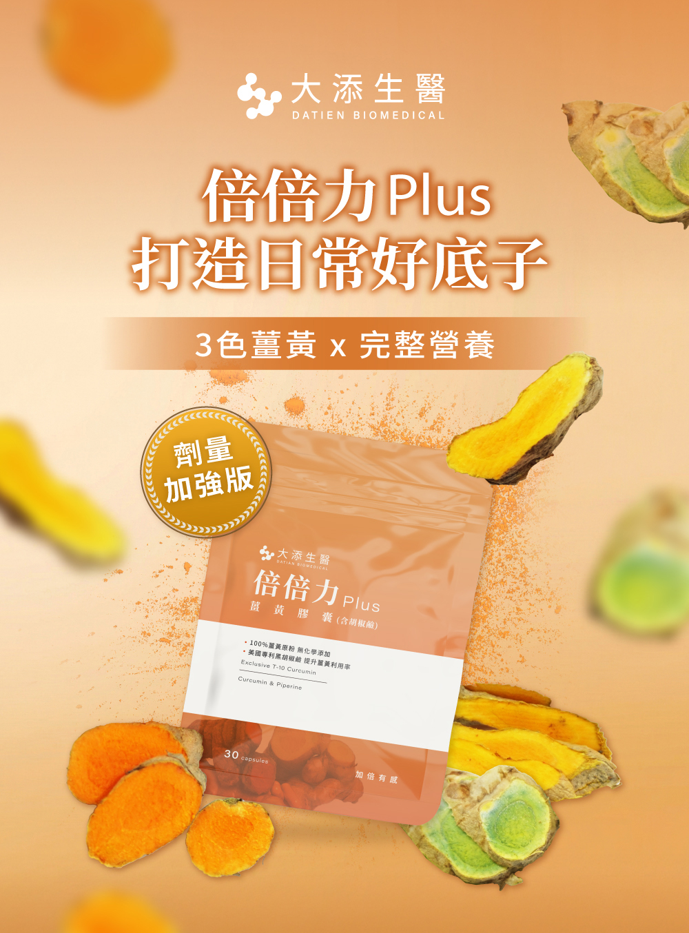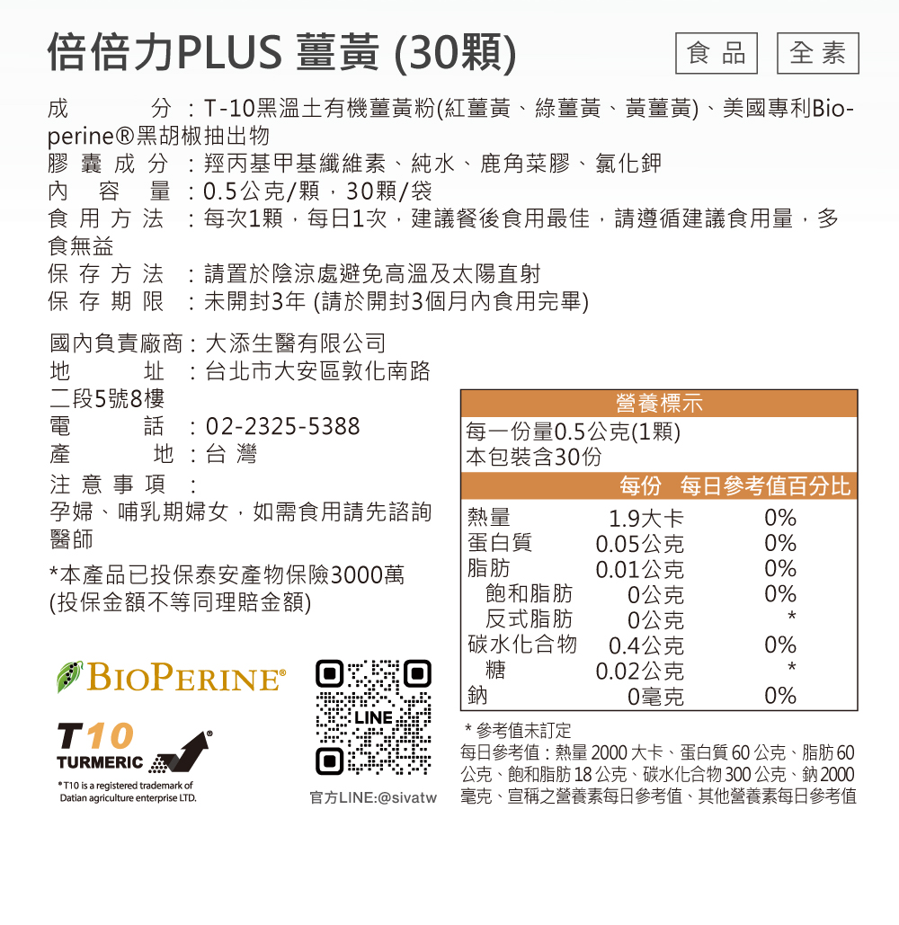 商品名稱:【大添生醫】倍倍力plus 薑黃(30顆/包) 規格:30顆/包 原產地(國):台灣 製造日期:依產品標示 有效期限:依產品標示 國內負責廠商名稱:大添生醫有限公司 國內負責廠商地址:台北市大安區敦化南路二段5號8樓 國內負責廠商電話:02-2325-5388 食品業者登錄字號:A-193615609-00000-7 投保產品責任險字號:07 字第062214C10681號