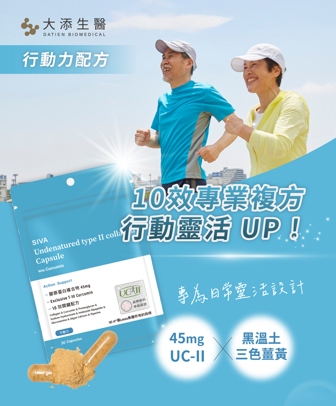 商品名稱:【大添生醫】行動力 10效薑黃膠原(30顆/包) 規格:30顆/包 原產地(國):台灣 製造日期:依產品標示 有效期限:依產品標示 國內負責廠商名稱:大添生醫有限公司 國內負責廠商地址:台北市大安區敦化南路二段5號8樓 國內負責廠商電話:02-2325-5388 食品業者登錄字號:A-193615609-00000-7 投保產品責任險字號:07 字第062214C10681號